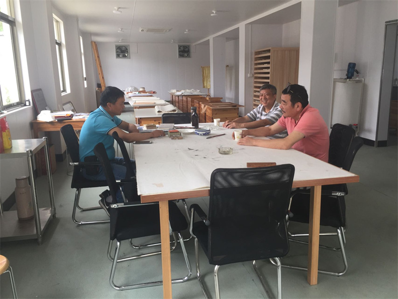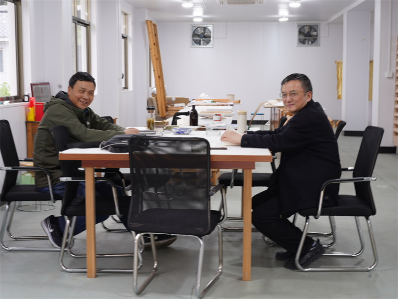 浙江省文化廳新安傳統(tǒng)文化調(diào)研,畫家樓森華、樓秋華和版畫藝術(shù)家王超在公司。徽州楮皮紙