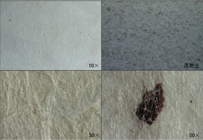 構(gòu)皮纖維雖不及麻纖維那么長(zhǎng),但遠(yuǎn)長(zhǎng)于竹纖維,一般在5-10mm 左右。由于構(gòu)皮本身具有一定的白度,纖維素含量也比較高,因此構(gòu)皮紙成紙白度一般要高于麻紙和竹紙,構(gòu)皮紙質(zhì)地較麻紙綿軟,韌性好,常被稱為“白棉紙”,亦有“蟬翼”、“冰肌”等雅喻。構(gòu)皮紙紙面的勻度和平滑度一般介于麻紙和竹紙之間,由于蒸煮過(guò)程中用到草木灰,構(gòu)皮紙一般潔白中略偏灰色,紙面纖維在光線照射下會(huì)泛出絲質(zhì)光澤。由于纖維較長(zhǎng)不易分散,成紙內(nèi)常見(jiàn)有未打散的纖維束,形態(tài)蜿蜒曲折,兩端多散開(kāi)呈絮狀(如圖1 左下)。構(gòu)皮紙?jiān)诖娣乓欢螘r(shí)間之后,紙面常見(jiàn)有零星的淺銹黃色暈點(diǎn)狀氧化斑,曾有文人墨客因此雅稱其為“桃花紙”。另外,手工抄造的構(gòu)皮紙?jiān)诶w維間還常會(huì)殘留一些構(gòu)皮外皮的黑灰色碎屑,這也是構(gòu)皮紙的一個(gè)特征(如圖1 右下)。